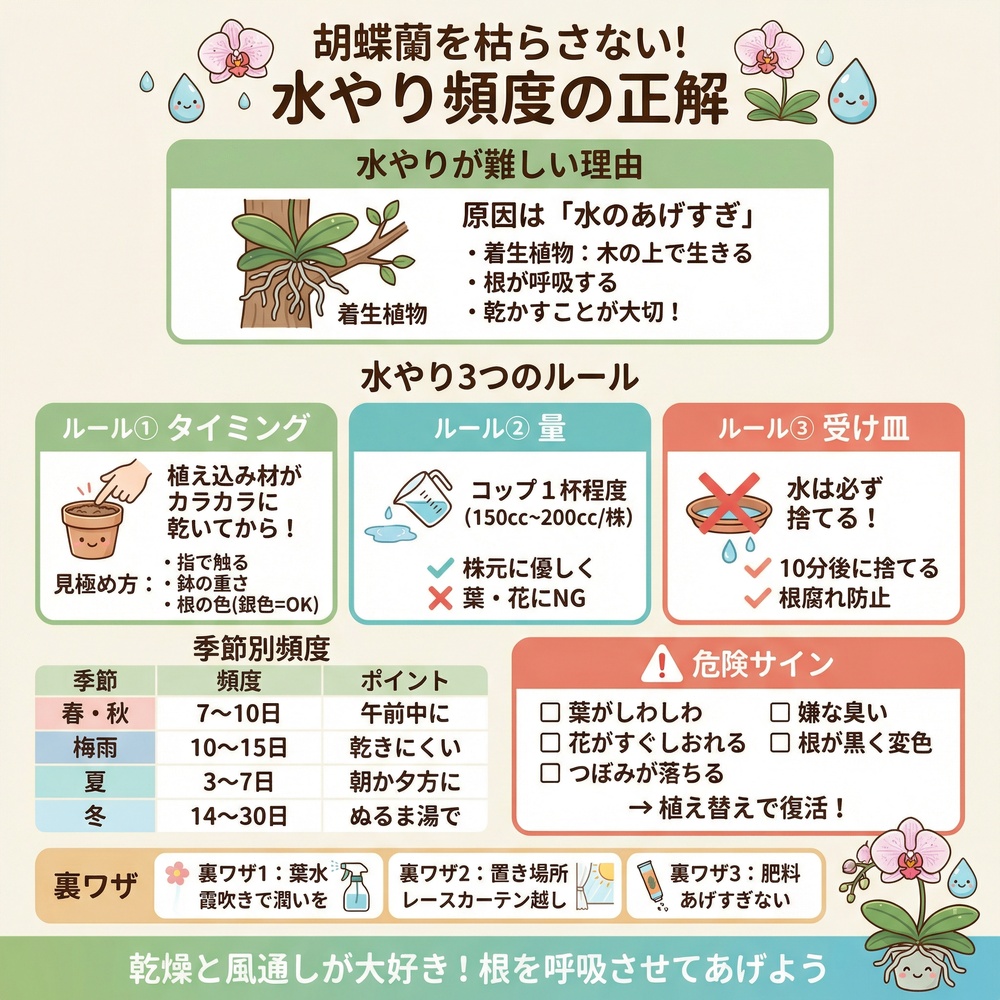 胡蝶蘭の根の秘密が分かったところで、いよいよ実践編です。水やりの基本は、たった3つのシンプルなルールを守るだけ。これさえ押さえれば、初心者の方でも失敗知らずです!
